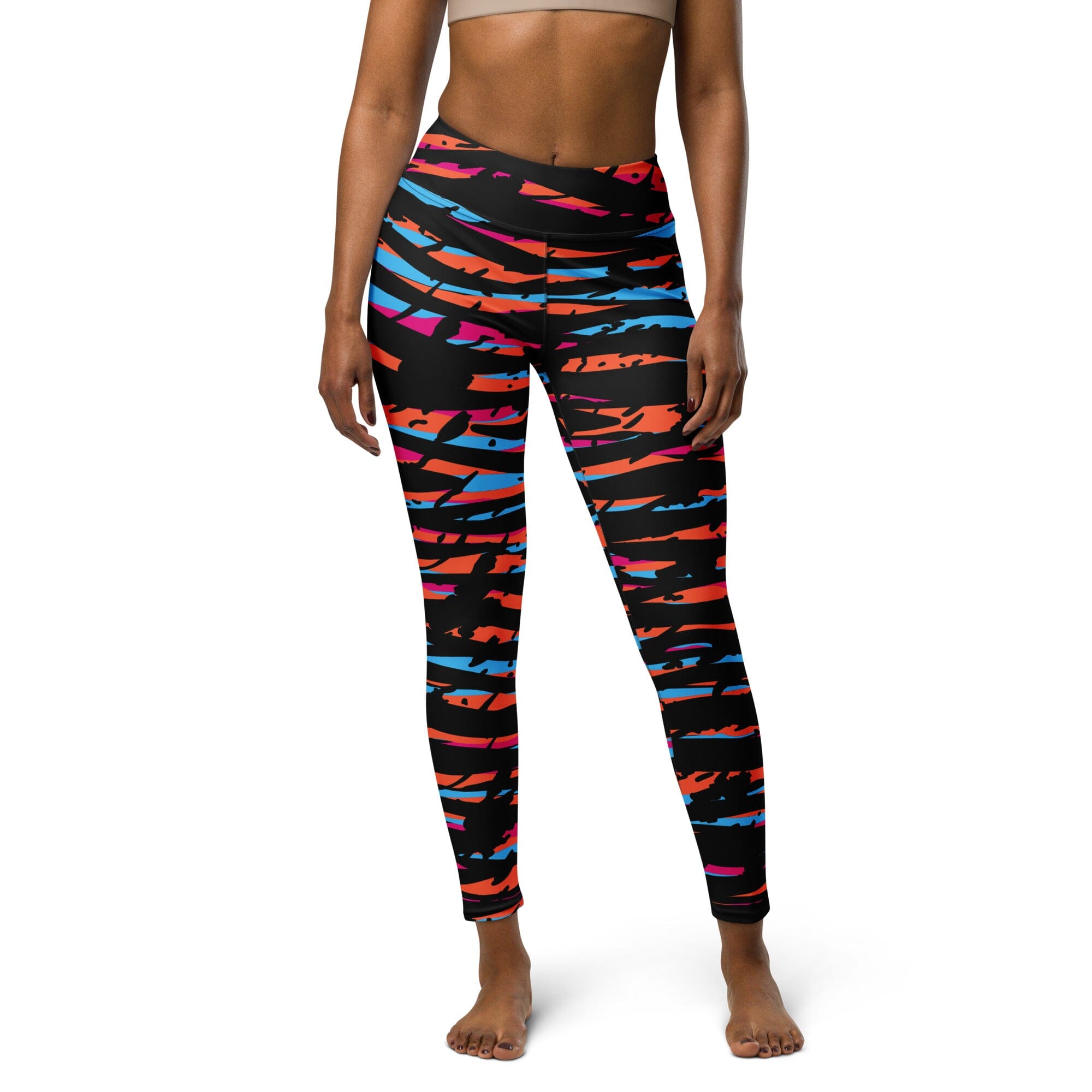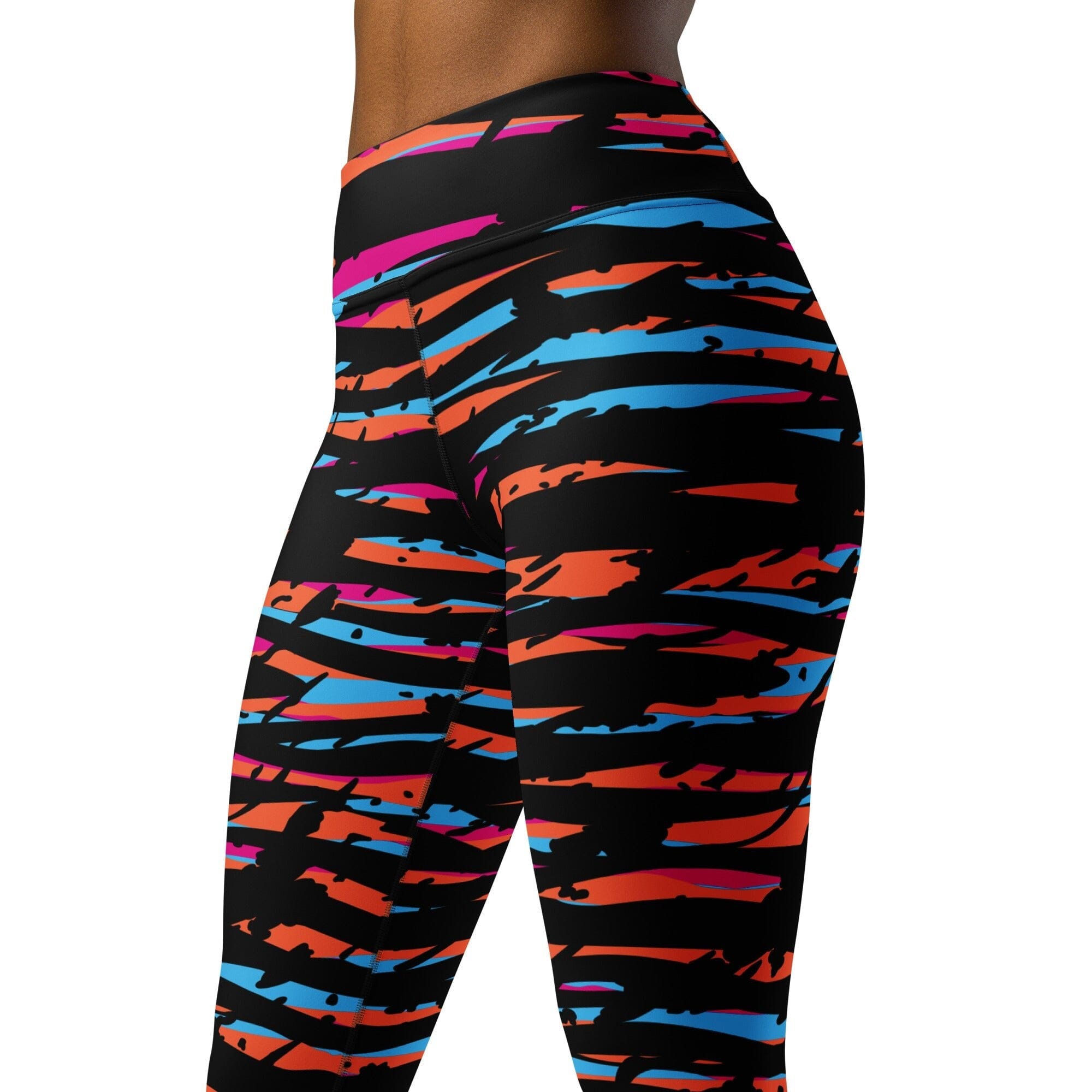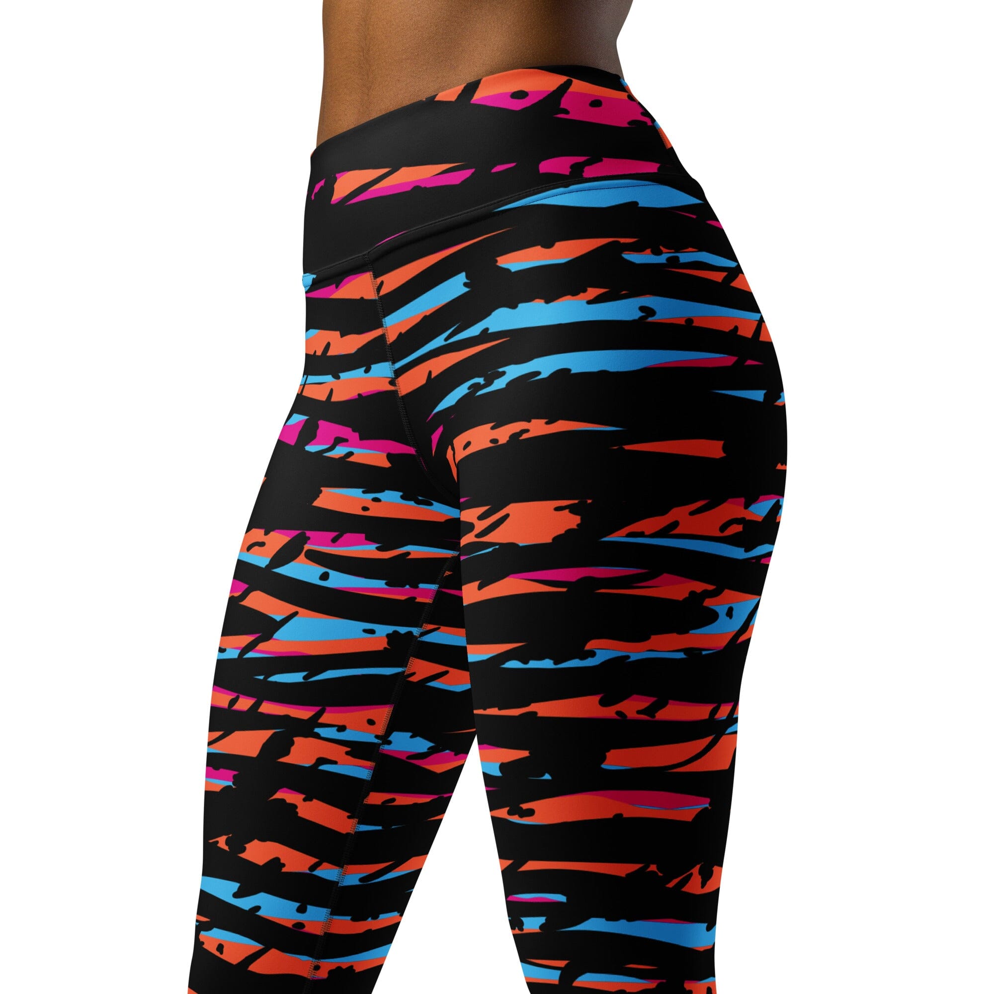 All-over-print Leggings Black and Neon. Super soft, stretchy, and comfortable yoga leggings. High waist provides perfect coverage during stretching and gentle sculpting. Triangular crotch gusset prevents ripping and the quick dry fabric never shows sweat stains. Striking abstract design in black and neon orange, pink and blue.