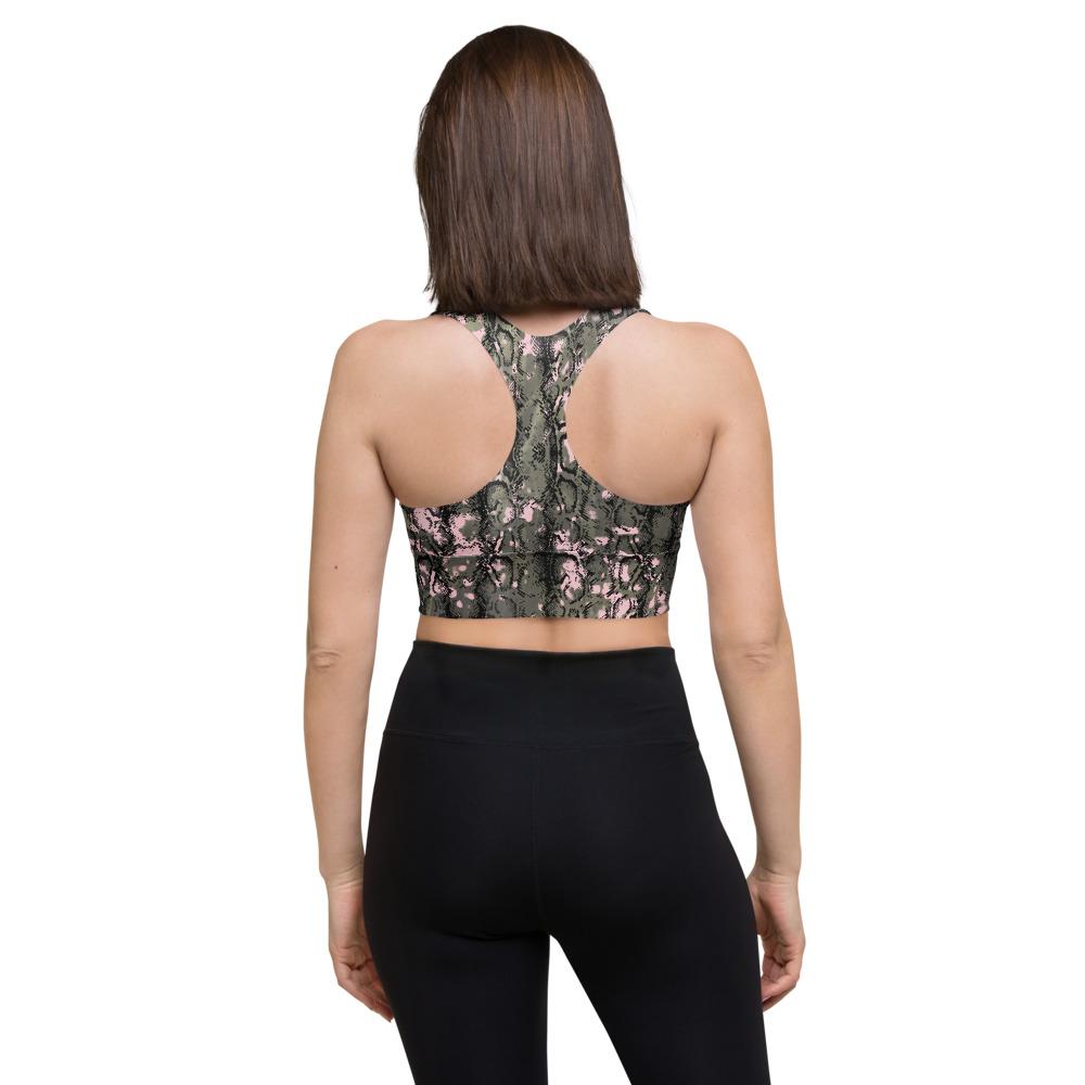 Snake print sports bra - Black and Pink. This sports bra is the perfect workout top for exercising. The compression fabric along with double-layered front and shoulder straps ensures great support while running, jumping, or pumping iron. Wear it while exercising or style it as a streetwear top on sunny days - if you pair it with our matching leggings, you're onto a head turning and high performance outfit.