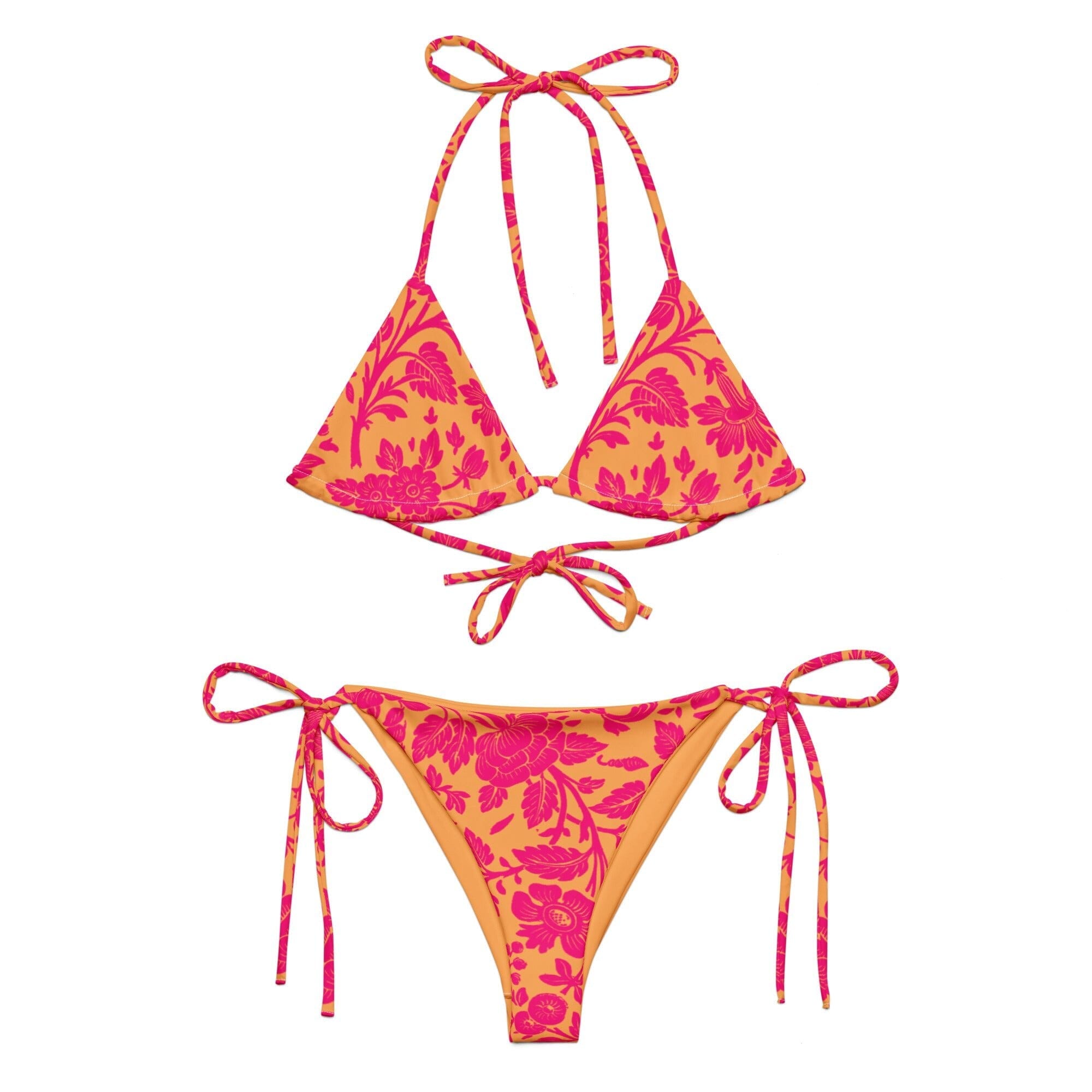 Pink Orange bikini Floral Antique, recycled, top and bottom - available as separates. Stay comfortable and trendy all summer with this recycled strappy side-tie bikini set. It’s made from soft recycled polyester with double-layering and UPF 50+. Style the straps in different ways - tie around the neck or at the front, or even crisscross. Get the matching bandana (here) for that resort look. Also available as a Crop Bralette Top + High waisted bikini bottom separates, so you can mix-and-match to get your perfect style (see here).