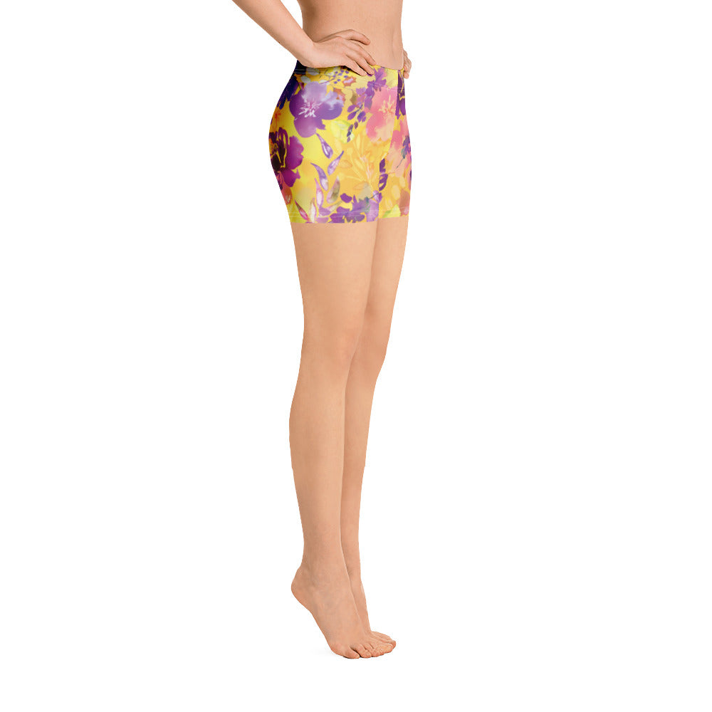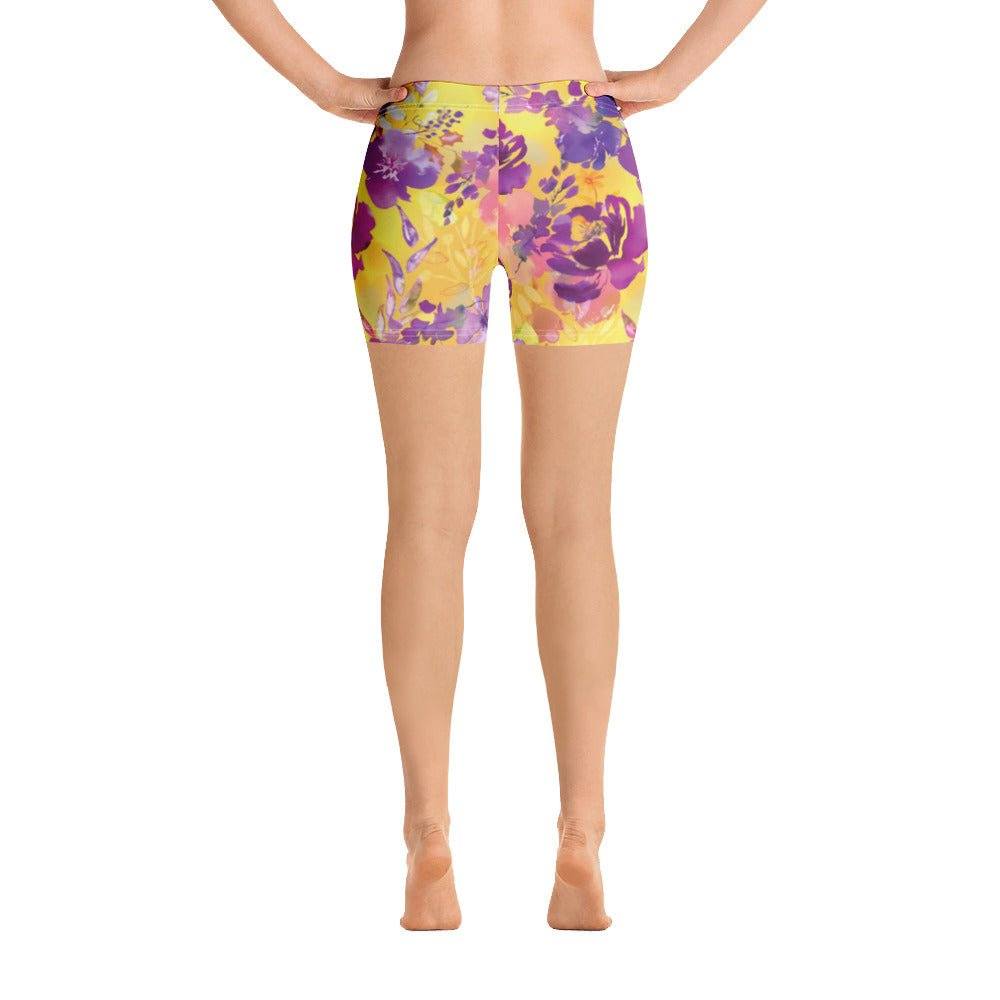 Workout Shorts Golden Floral. You can never go wrong with shorts that fit just right whatever you're doing. Nature inspired vibrant print in royal shades of gold and purple. Available in regular and high waist option - high waist is perfect for yoga and pilates as it keeps you covered and also provides gentle tummy tucking. Also, this variant has a crotch gusset to maximize elasticity and prevent ripping.