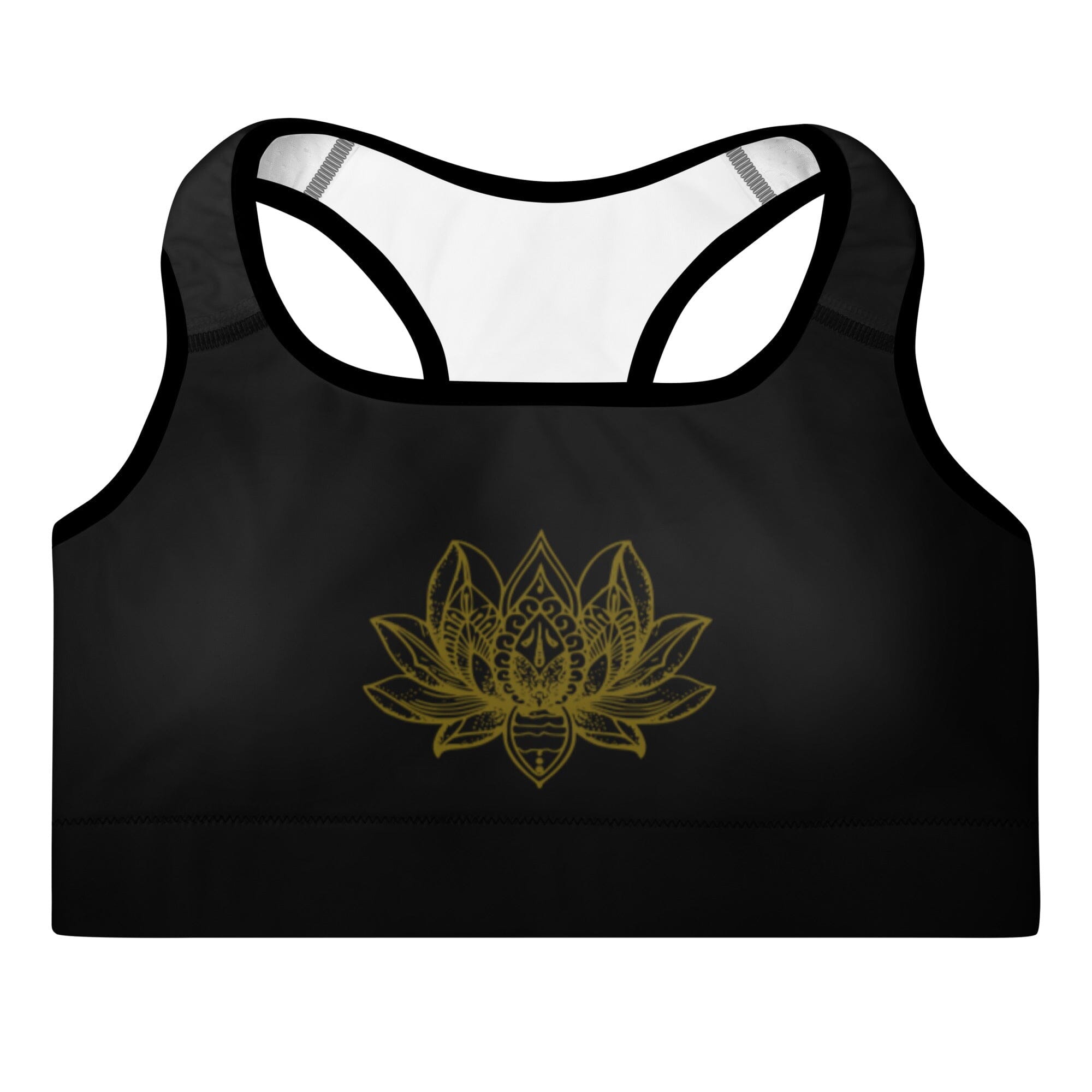 Golden Mandala Sports Bra. Get the perfect bra for your workouts! This comfy bra has a soft moisture-wicking fabric, extra materials in shoulder straps, and removable padding for maximum support. Intricate and spiritual mandala design in gold will energize your practice.